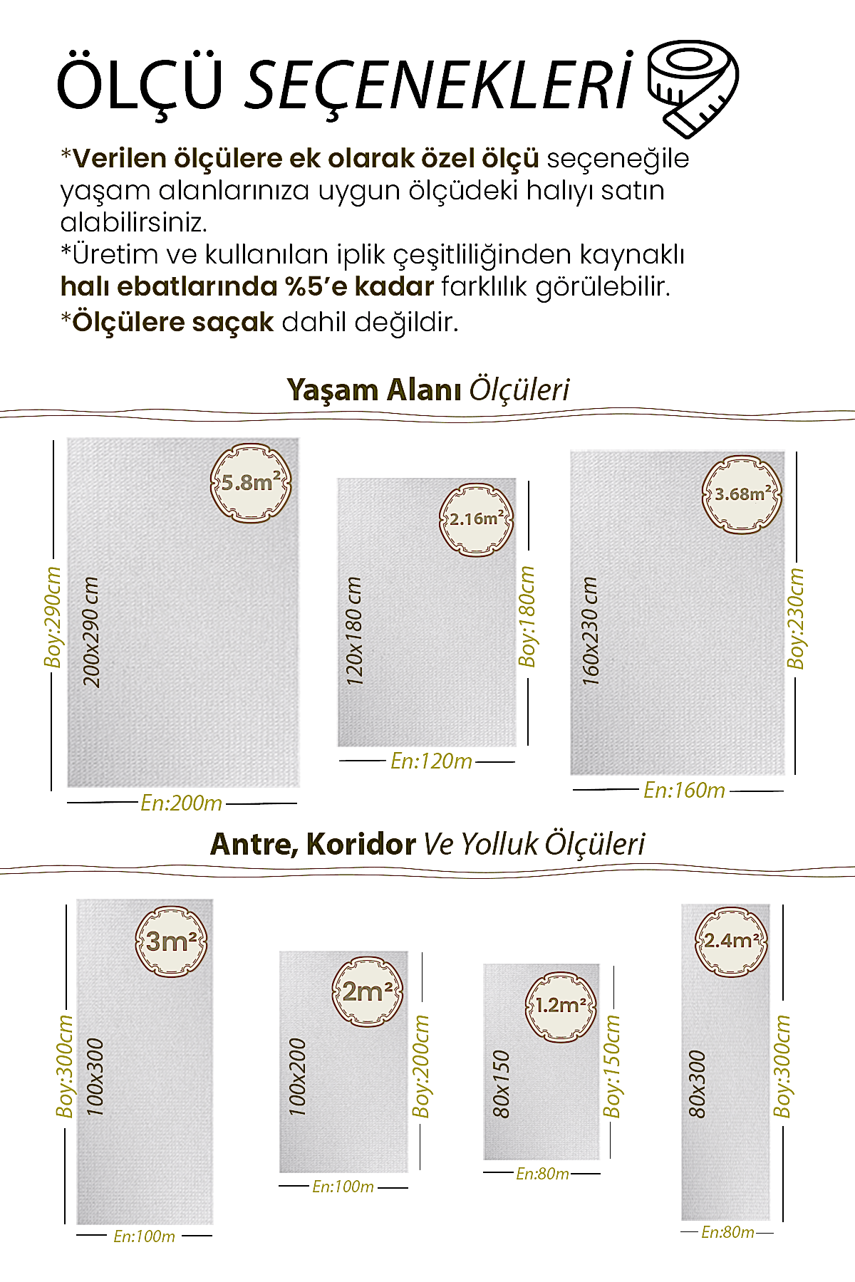 | Ölçü | 80×150, 100×150, 80×200, 80×250, 100×200, 120×180, 80×300, 120×200, 100×250, 80×350, 100×300, 120×250, 80×400, 160×200, 100×350, 80×450, 120×300, 160×230, 80×500, 100×400, 160×250, 120×350, 100×450, 120×400, 160×300, 100×500, 200×250, 120×450, 200×290, 120×500 |