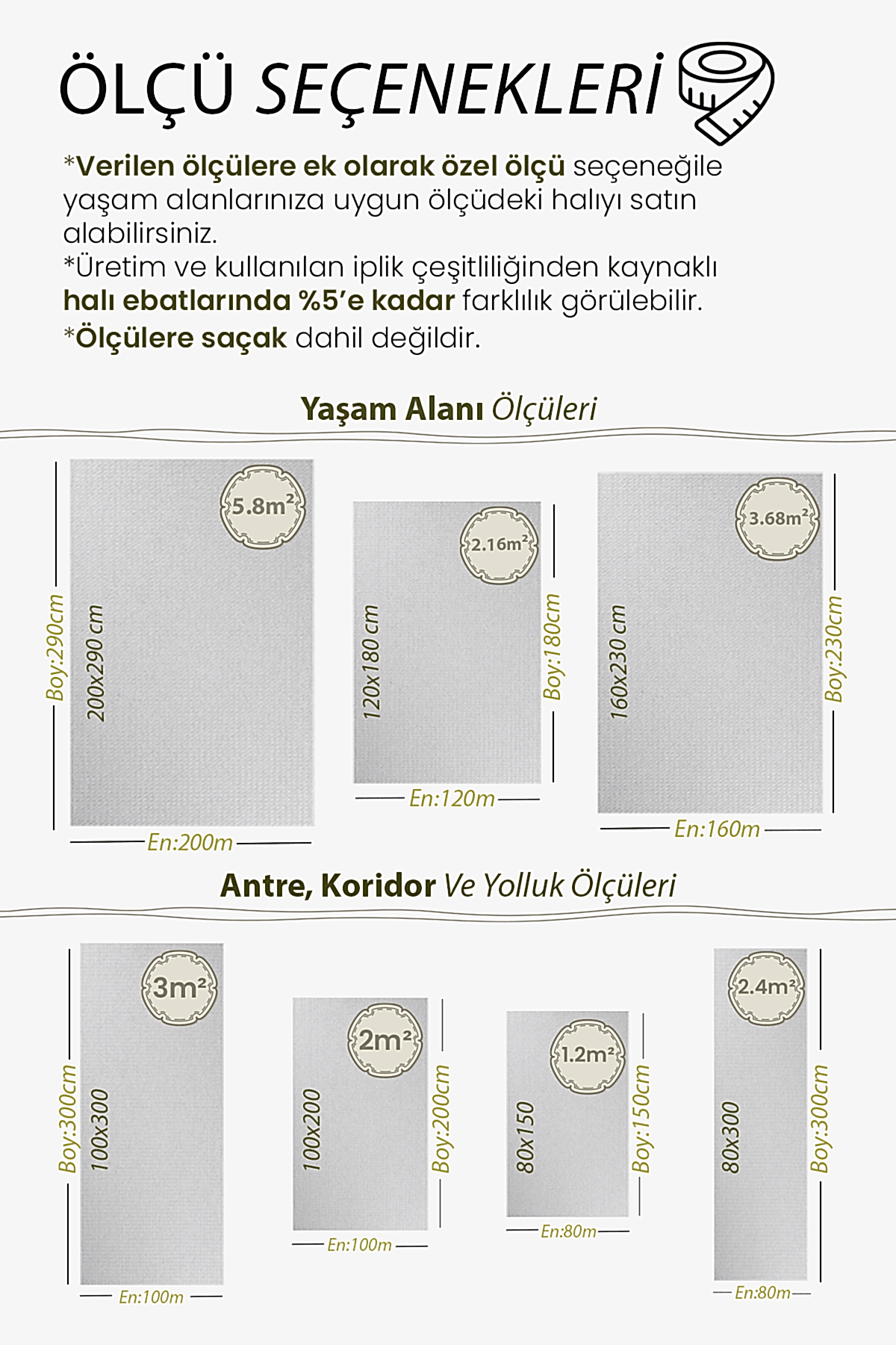 | Ölçü | 80×150, 100×150, 80×200, 80×250, 100×200, 120×180, 80×300, 120×200, 100×250, 80×350, 100×300, 120×250, 80×400, 160×200, 100×350, 80×450, 120×300, 160×230, 80×500, 100×400, 160×250, 120×350, 100×450, 120×400, 160×300, 100×500, 200×250, 120×450, 200×290, 120×500 |