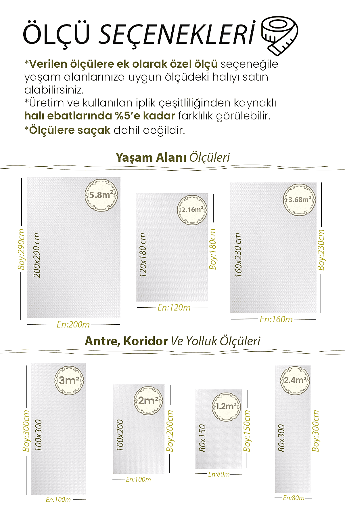 | Ölçü | 80×150, 80×300, 100×200, 100×300, 120×180, 160×230, 200×290 |