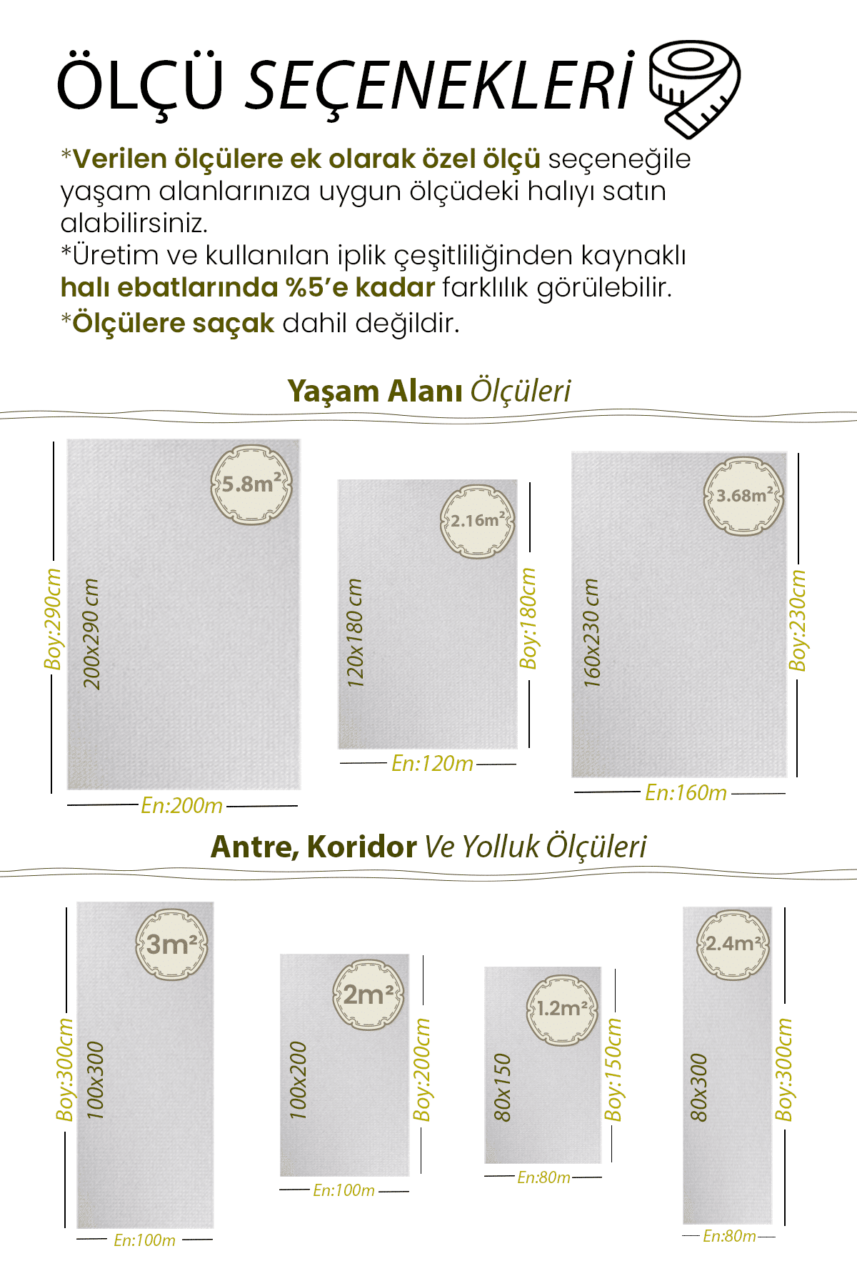 | Ölçü | 80×150, 80×200, 80×250, 80×300, 80×350, 80×400, 80×450, 80×500, 100×150, 100×200, 120×180, 120×200, 100×250, 100×300, 120×250, 160×200, 100×350, 120×300, 160×230, 160×250, 100×400, 120×350, 100×450, 120×400, 160×300, 200×250, 100×500, 120×450, 200×290, 120×500 |