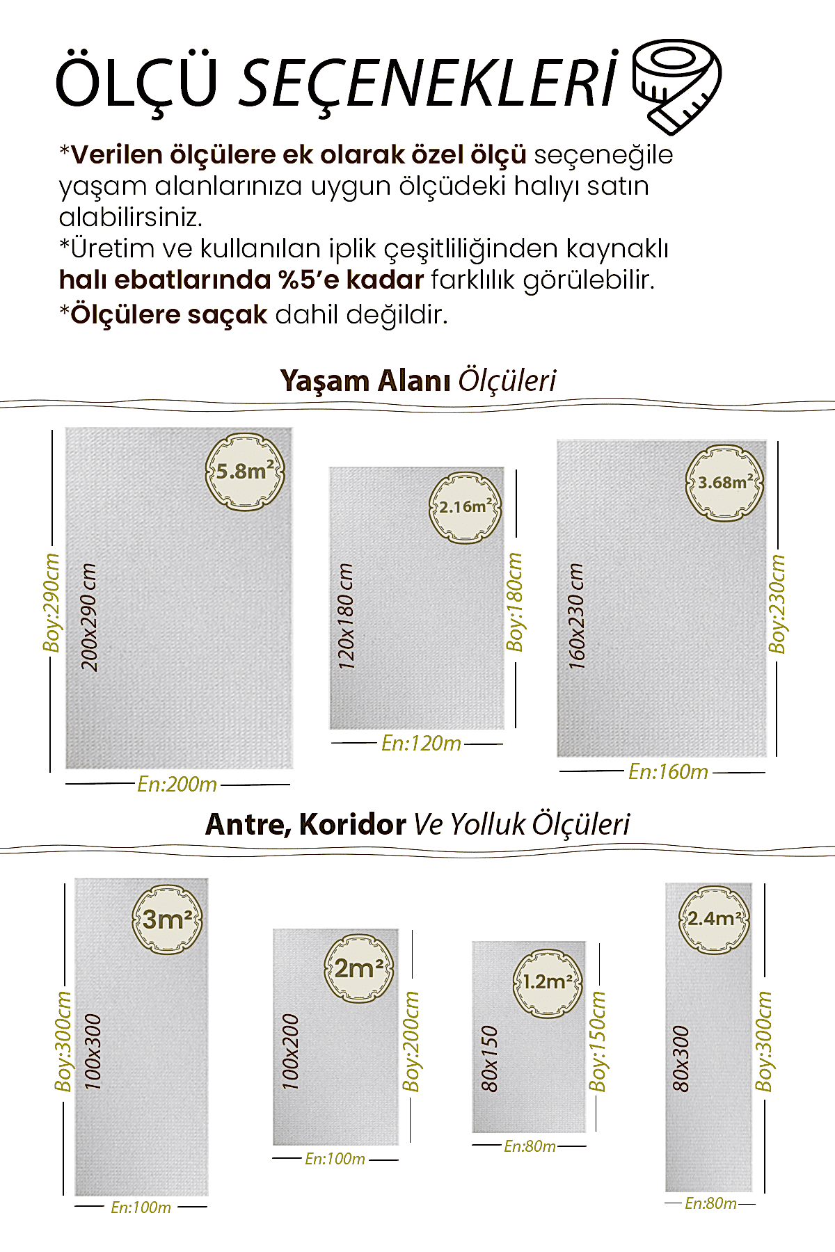 | Ölçü | 80×150, 80×300, 100×200, 120×180, 100×300, 160×230, 200×290 |