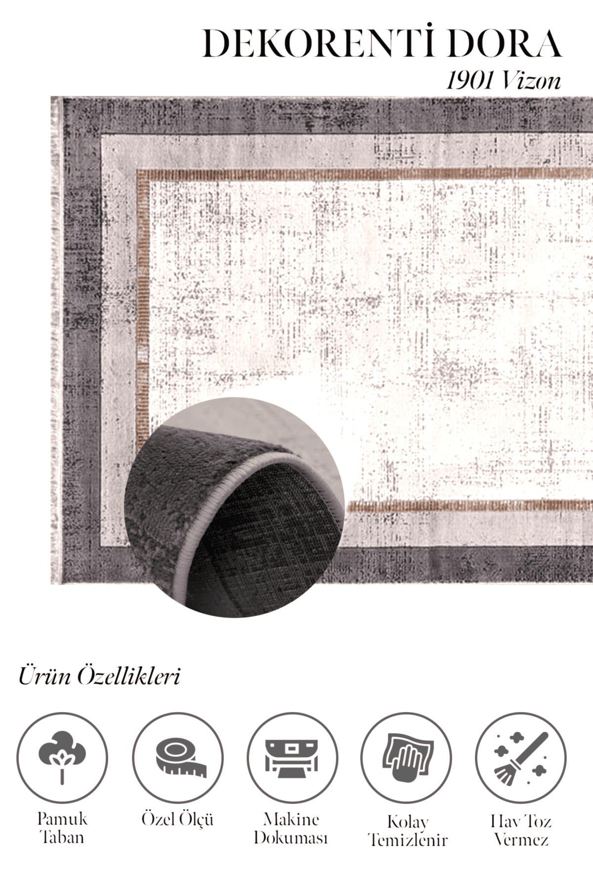 Yenilikçi ve modern desen türleriyle Dora serisi evinizde şık bir görüntü çizer. Dokusunda çerçeveli ve modern çizgiler hakimdir. Üstelik Dekorenti markasının en ekonomik halısıdır. Pamuk tabanlıdır ve ön kısımları katlamadır. Özellikle salon, yatak odasında ve misafir odasında tercih edilmesi halıyı daha kullanışlı ve uzun ömürlü kılar. Ayrıca Dora Serisi vizon, mavi, gri ve beyaz tonlarıyla zengin renk seçeceği sunar. Hav ipi polip olması halıya hem tozumaz ve antialerjik özellik katar hem de temizliği daha kolaydır. Diğer özelliklerine bakıldığında 640.000 ilme ucu sıklığında, 9 mm hav yüksekliğinde ve yan tarafları lazer kesim polyester makina halısıdır.