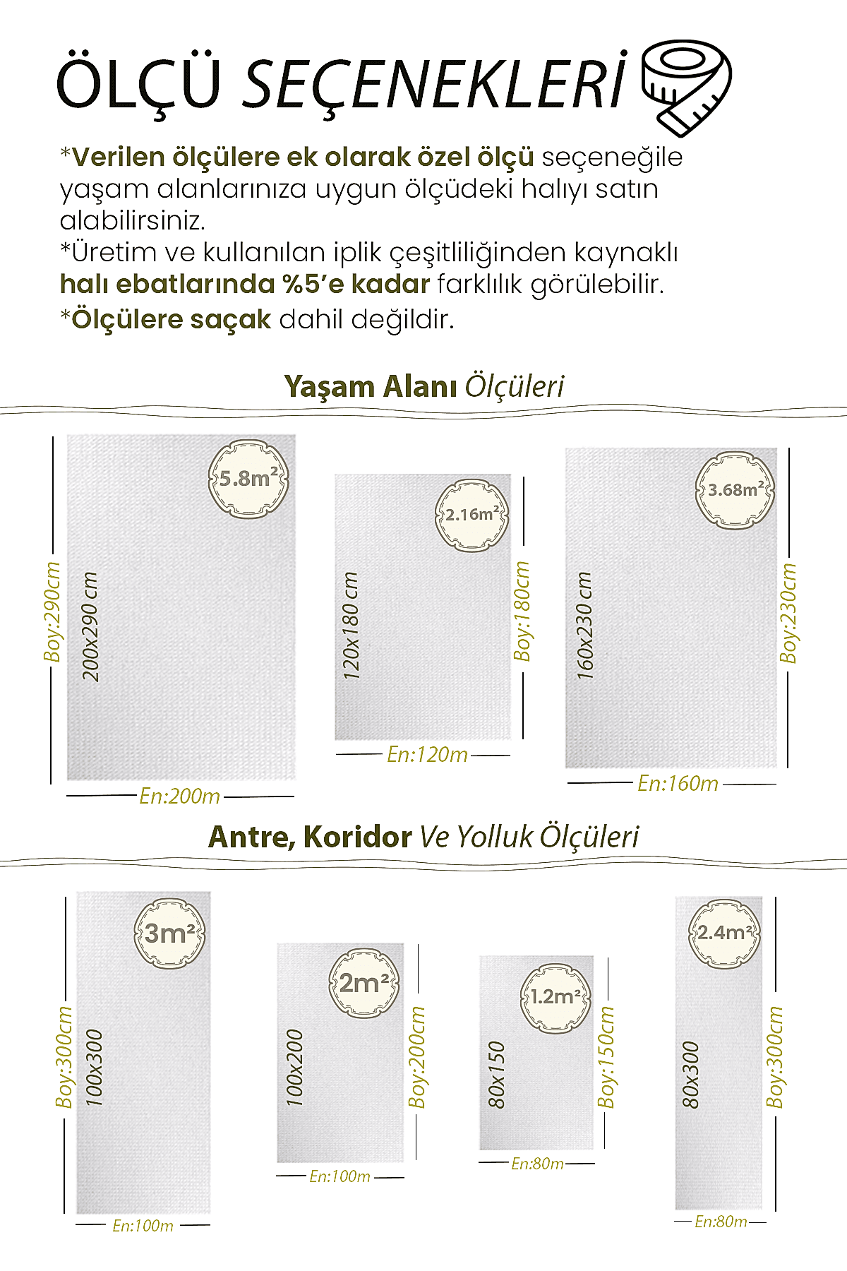 | Ölçü | 160×230, 200×290, 80×150, 80×300, 100×200, 100×300, 120×180 |