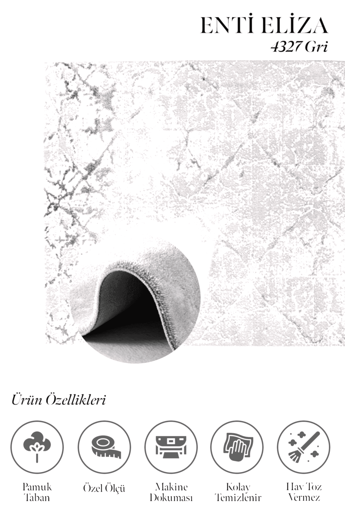 Eliza 4327 Gri – Pamuk Tabanlı, Kolay Temizlenen Gri Halı