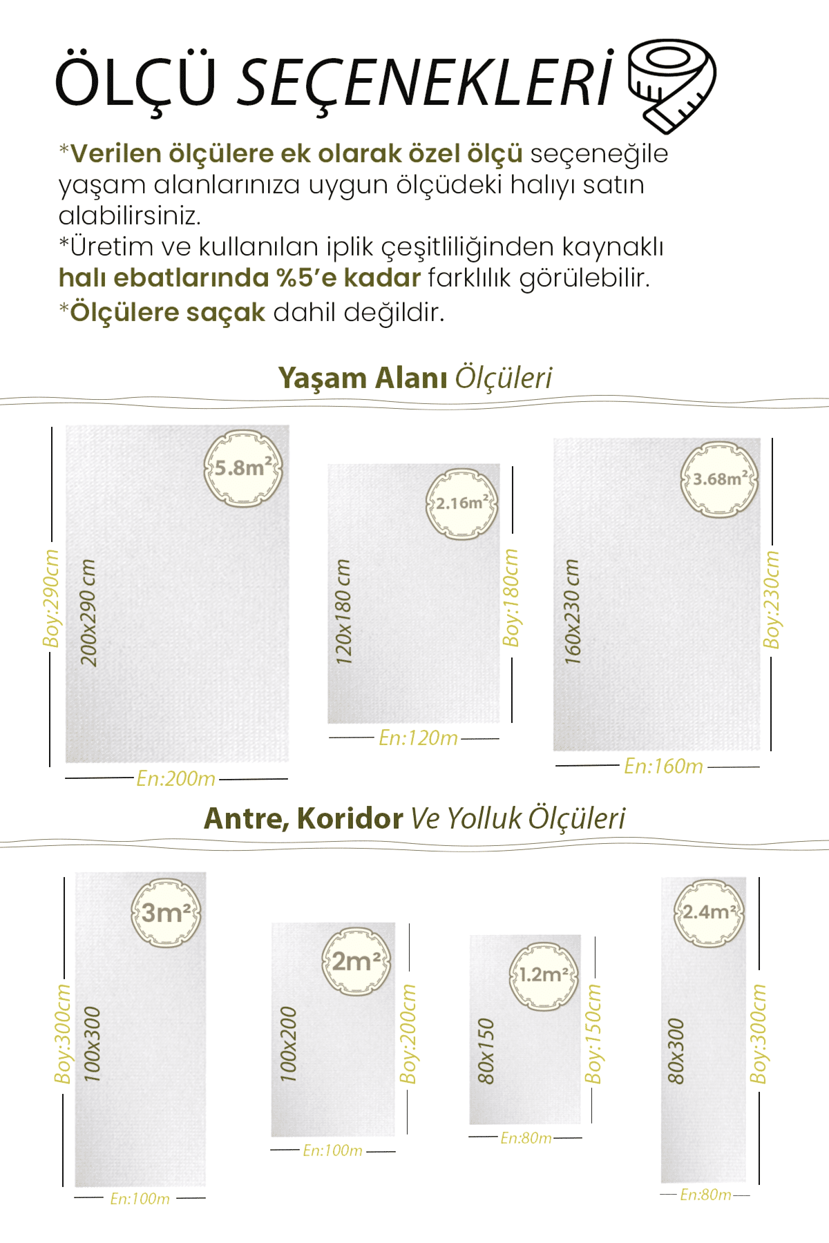 | Ölçü | 80×150, 100×150, 80×200, 80×250, 100×200, 120×180, 80×300, 120×200, 100×250, 80×350, 100×300, 120×250, 80×400, 160×200, 100×350, 80×450, 120×300, 160×230, 80×500, 100×400, 160×250, 120×350, 100×450, 120×400, 160×300, 100×500, 200×250, 120×450, 200×290, 120×500 |