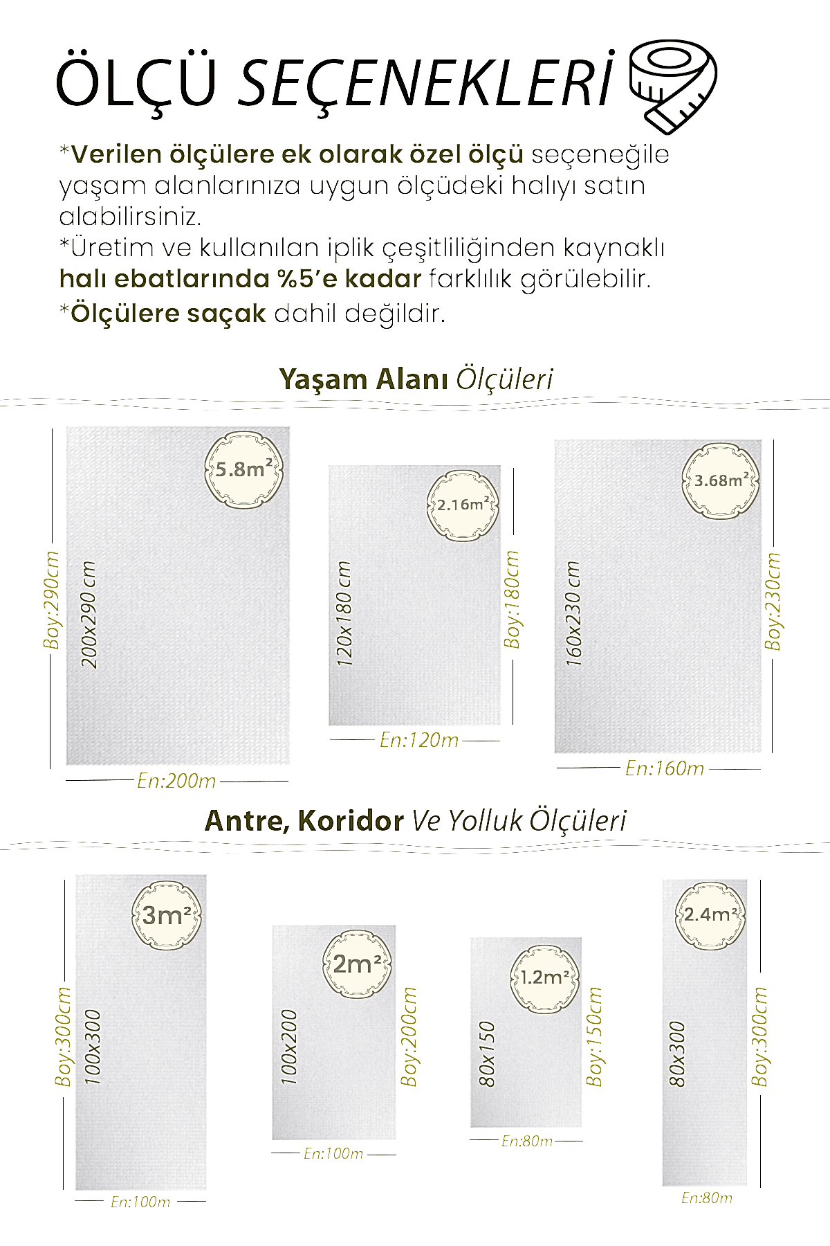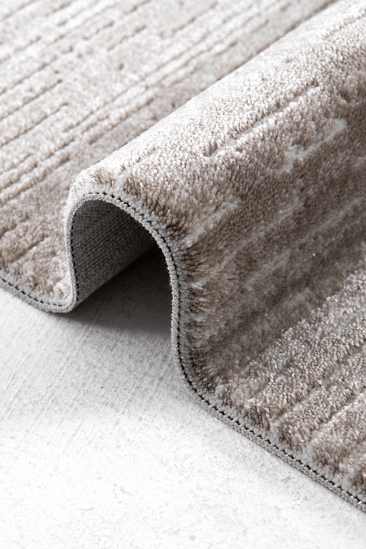 Üst yüzeyinde kullanılan yüksek kaliteli akrilik iplik, yumuşak dokusu ve canlı renkleriyle uzun yıllar ilk günkü şıklığını korur. Lazer kesim kenar detayı, halıya modern ve kusursuz bir görünüm kazandırırken; sade ve zarif spor saçak tasarımıyla çağdaş dekorasyonlara uyum sağlar.