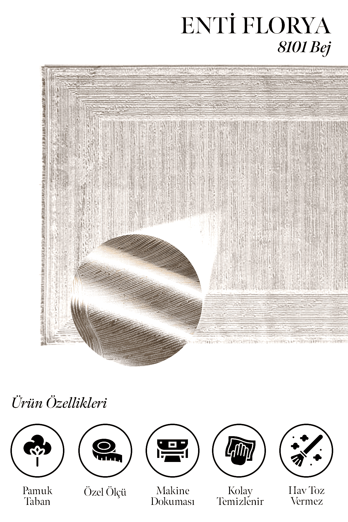 Enti halı markasının yeni serisi Florya’nın yüzeyindeki şık çizgileri ile oluşan desenler halıya modern bir hava katar. Ayrıca dokusunda en çok tercih edilen krem ve bej renkler hakimdir. Üstelik yumuşak bir yüzeye sahiptir ve hav, tüy çıkarmaz. Yan kenarları overlok dikişli, ön kısımları spor saçaklıdır ve pamuk atkılı tabana sahip bir modeldir. Florya serisi gerek kolay temizlenir olması gerekse neme küfe dayanıklı olmasından dolayı evin bir çok alanında verimli olarak kullanılır. Mikro polyester iplik türünde bir makina halısıdır.
