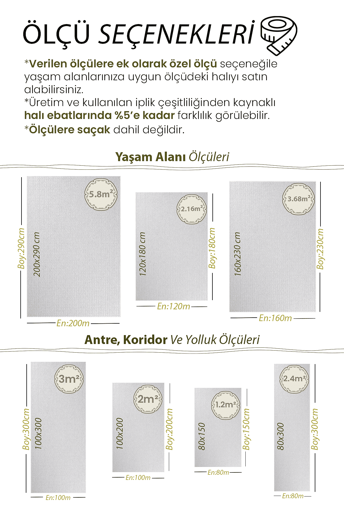 | Ölçü | 80×150, 100×150, 80×200, 80×250, 100×200, 120×180, 80×300, 120×200, 100×250, 80×350, 120×250, 80×400, 160×200, 100×350, 80×450, 120×300, 160×230, 80×500, 100×400, 160×250, 120×350, 100×450, 120×400, 160×300, 100×500, 200×250, 120×450, 200×290, 120×500 |