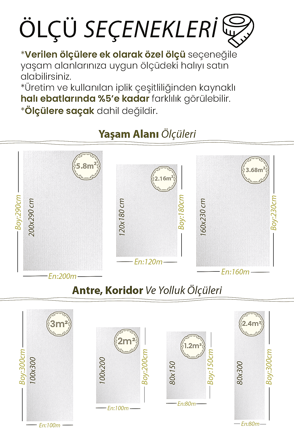 | Ölçü | 80×150, 100×150, 80×200, 80×250, 100×200, 120×180, 80×300, 120×200, 100×250, 80×350, 100×300, 120×250, 80×400, 160×200, 100×350, 120×300, 160×230, 80×500, 100×400, 160×250, 120×350, 100×450, 120×400, 160×300, 100×500, 120×450, 200×290, 120×500 |