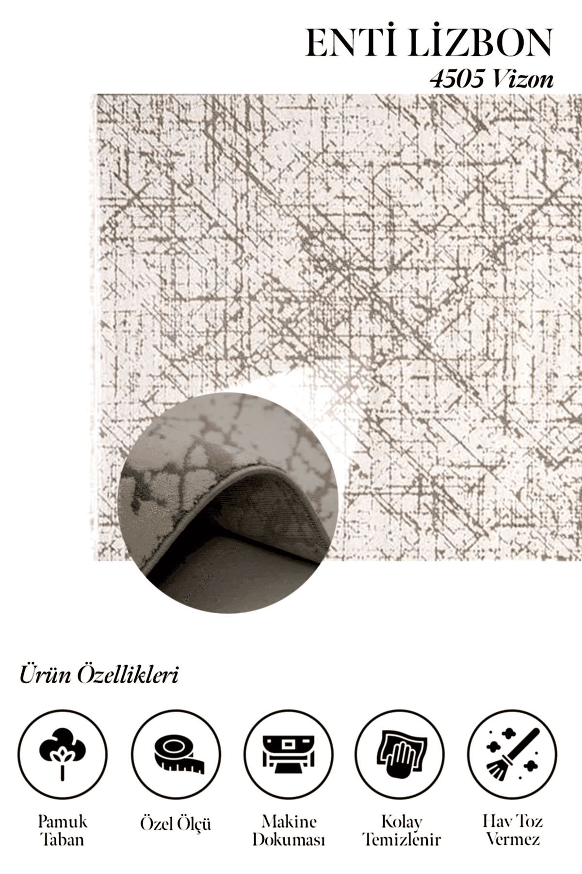 Lizbon serisinin özelliklerine baktığımızda akrilik iplik türünde olması sebebiye halının yumuşak bir dokusu vardır. Üstelik temizliği kolaydır. Gerek göbekli desenleri gerekse çerçeveli ve modern çizgilerin hakim olduğu desenleri ile farklı alternatifleri olan bir seridir. Lizbon serisinde taba ve vizon renkler hakimdir. Ayrıca 487.000 ilme ucu sıklığında, pamuk tabanlı, saçaklı ve kenarları overlok dikişli makina halısıdır. Enti halı ile evinizi yenileyin ve yeni serisi Lizbon ile evinizde yeni adımlar atın.