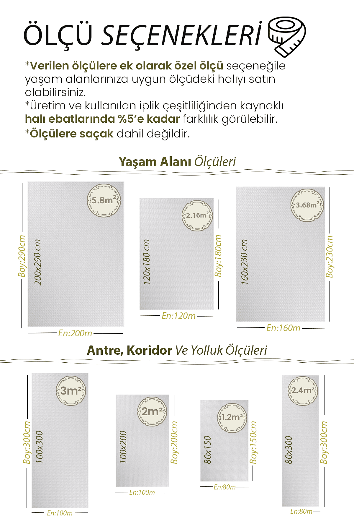 | Ölçü | 160×230, 200×290, 80×150, 100×150, 80×200, 80×250, 100×200, 120×180, 80×300, 120×200, 100×250, 80×350, 100×300, 120×250, 80×400, 160×200, 100×350, 80×450, 120×300, 80×500, 100×400, 160×250, 120×350, 100×450, 120×400, 160×300, 100×500, 200×250, 120×450, 120×500 |