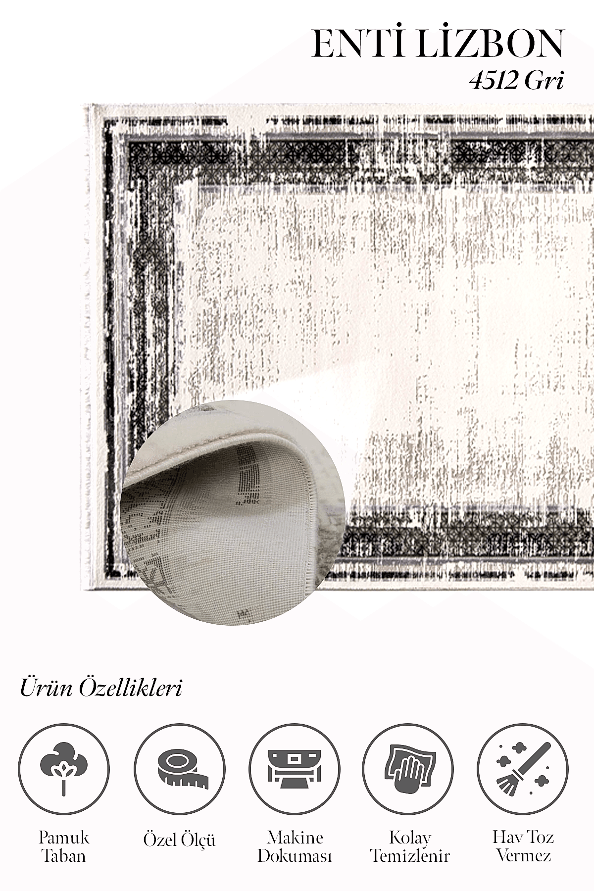 Lizbon serisinin özelliklerine baktığımızda akrilik iplik türünde olması sebebiye halının yumuşak bir dokusu vardır. Üstelik temizliği kolaydır. Gerek göbekli desenleri gerekse çerçeveli ve modern çizgilerin hakim olduğu desenleri ile farklı alternatifleri olan bir seridir. Lizbon serisinde taba ve vizon renkler hakimdir. Ayrıca 487.000 ilme ucu sıklığında, pamuk tabanlı, saçaklı ve kenarları overlok dikişli makina halısıdır. Enti halı ile evinizi yenileyin ve yeni serisi Lizbon ile evinizde yeni adımlar atın.