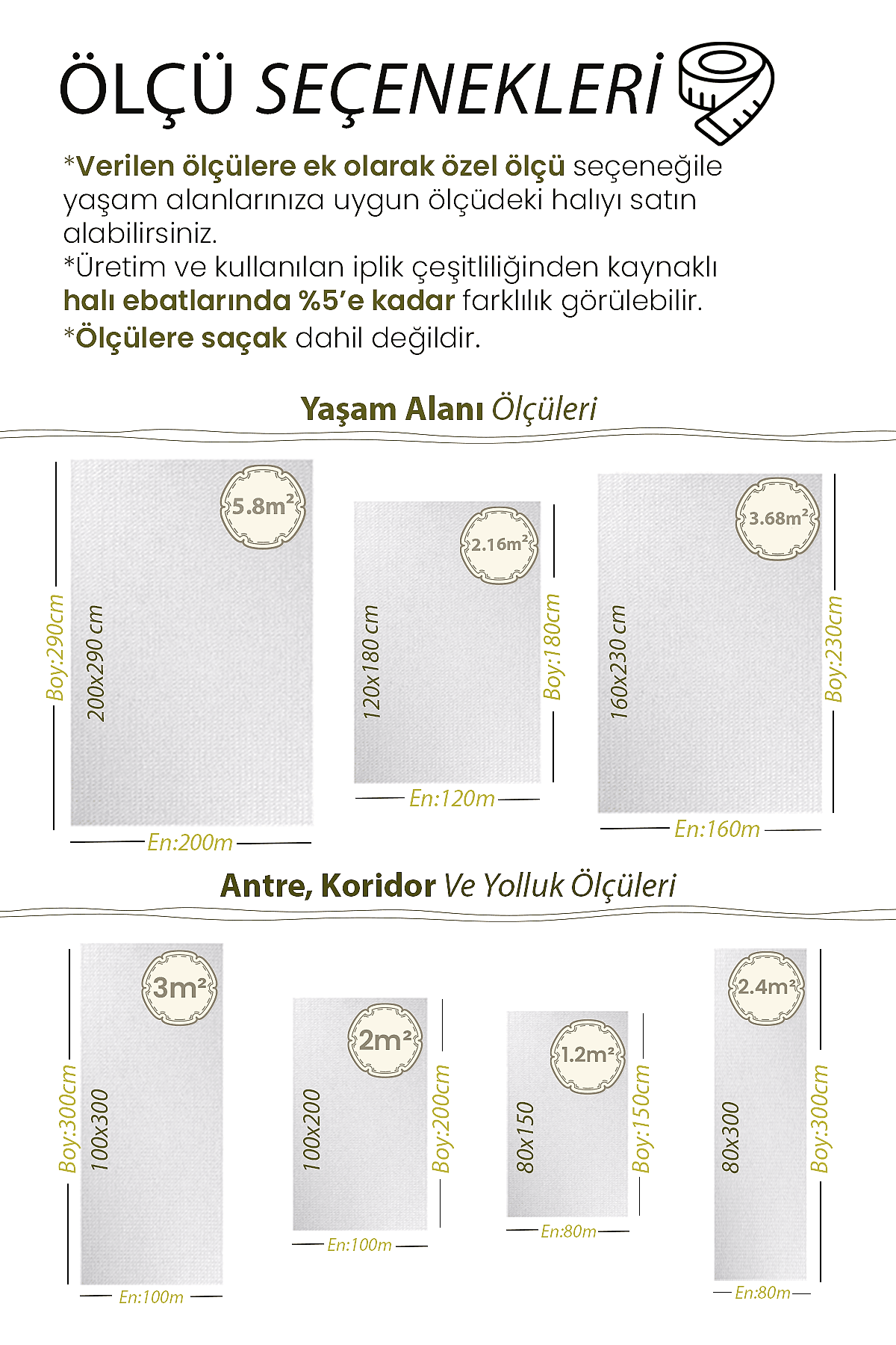 | Ölçü | 80×150, 80×300, 100×200, 120×180, 100×300, 160×230, 200×290 |