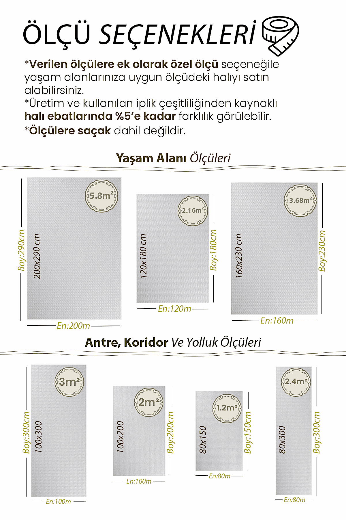 | Ölçü | 80×150, 100×150, 80×200, 80×250, 100×200, 120×180, 80×300, 120×200, 100×250, 80×350, 100×300, 120×250, 80×400, 160×200, 100×350, 80×450, 120×300, 160×230, 80×500, 100×400, 160×250, 120×350, 100×450, 120×400, 160×300, 100×500, 120×450, 200×290, 120×500 |