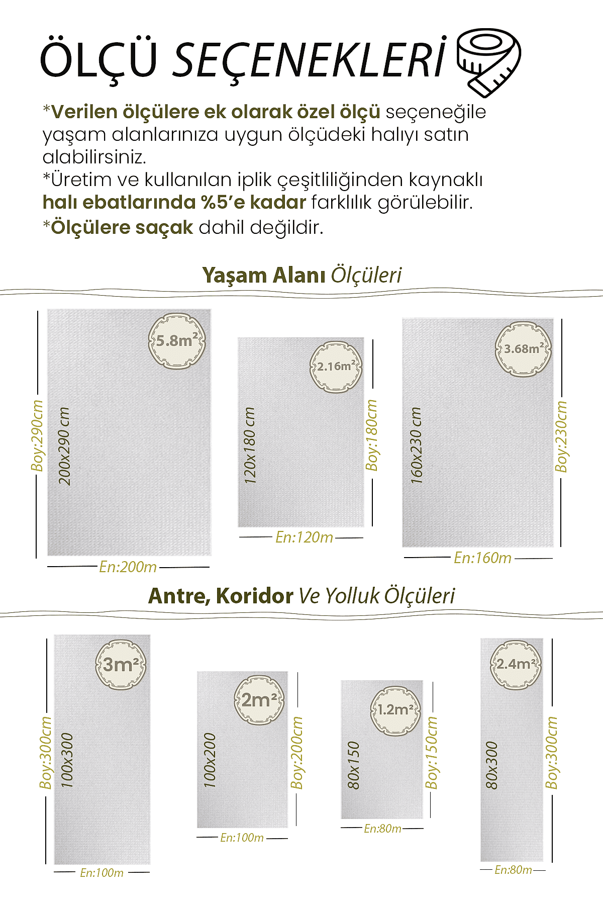 | Ölçü | 80×150, 100×200, 120×180, 80×300, 100×300, 160×230, 200×290 |