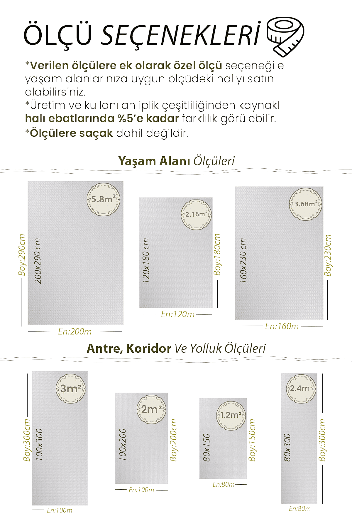 | Ölçü | 80×150, 100×200, 120×180, 80×300, 100×300, 160×230, 200×290 |