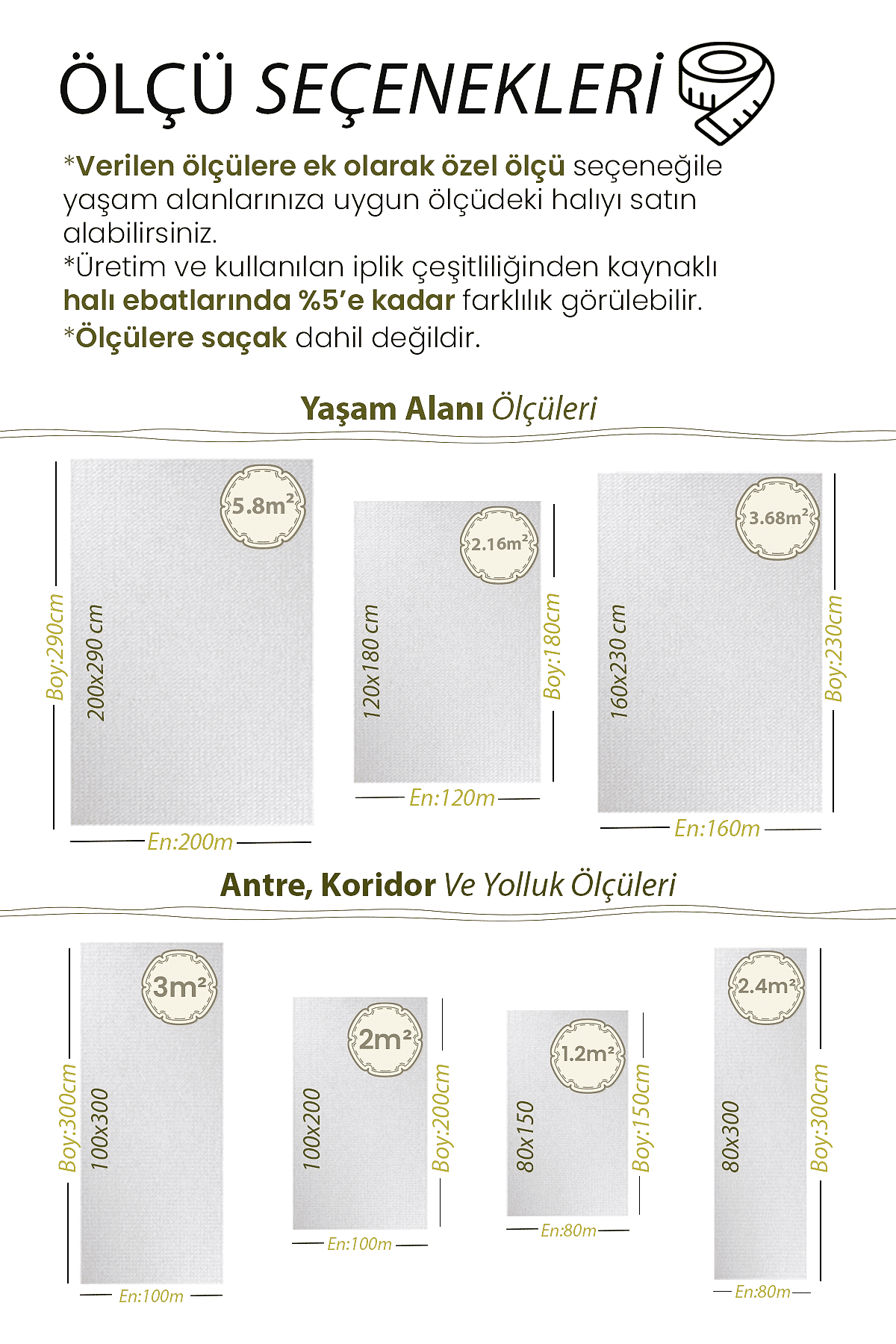 | Ölçü | 80×150, 100×150, 80×200, 80×250, 100×200, 120×180, 80×300, 120×200, 100×250, 80×350, 100×300, 120×250, 80×400, 160×200, 100×350, 80×450, 120×300, 160×230, 80×500, 100×400, 160×250, 120×350, 100×450, 120×400, 160×300, 100×500, 120×450, 200×290, 120×500 |