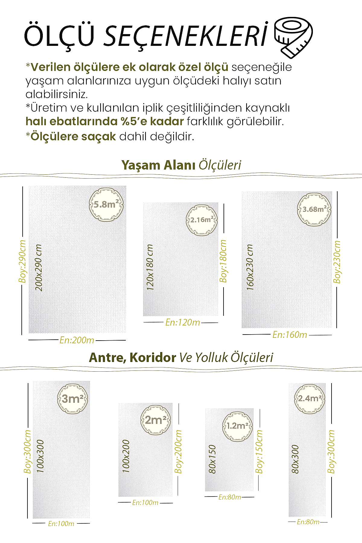 | Ölçü | 80×150, 100×200, 120×180, 80×300, 100×300, 160×230, 200×290 |