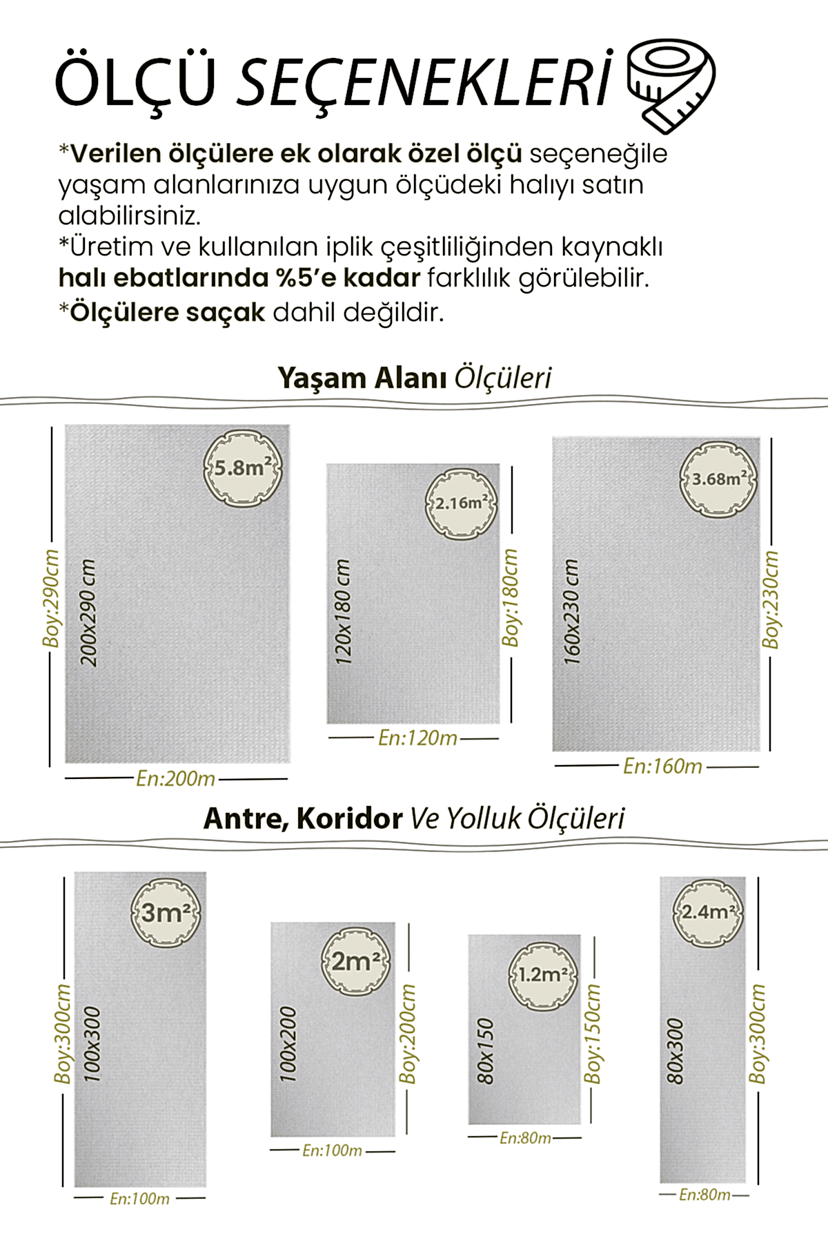 | Ölçü | 80×150, 100×200, 120×180, 80×300, 100×300, 160×230, 200×290 |