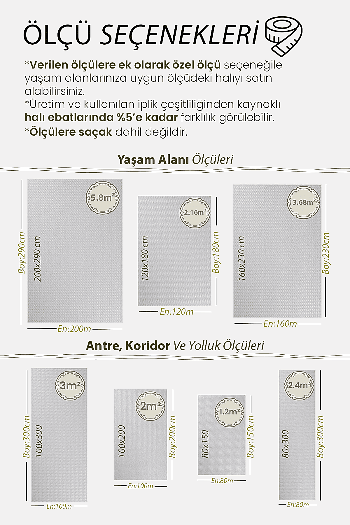 | Ölçü | 80×150, 80×300, 100×200, 100×300, 120×180, 160×230, 200×290 |