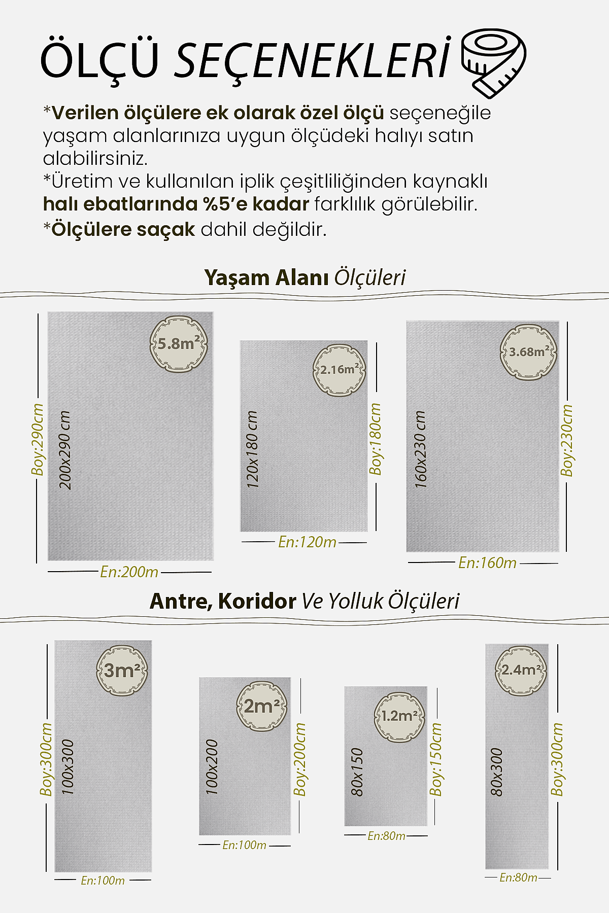 | Ölçü | 80×150, 80×300, 100×200, 120×180, 100×300, 160×230, 200×290, 240×340 |