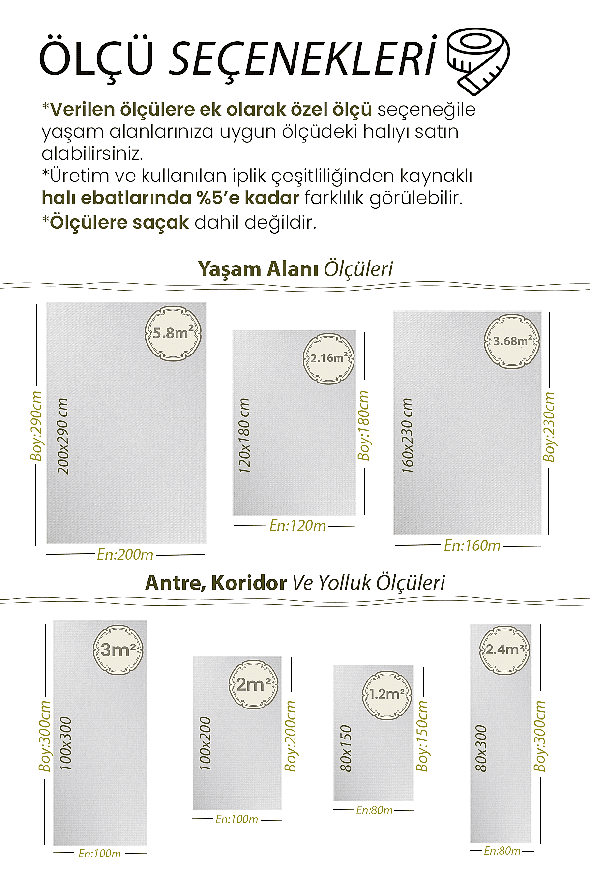 | Ölçü | 80×150, 80×300, 100×200, 120×180, 100×300, 160×230, 200×290 |