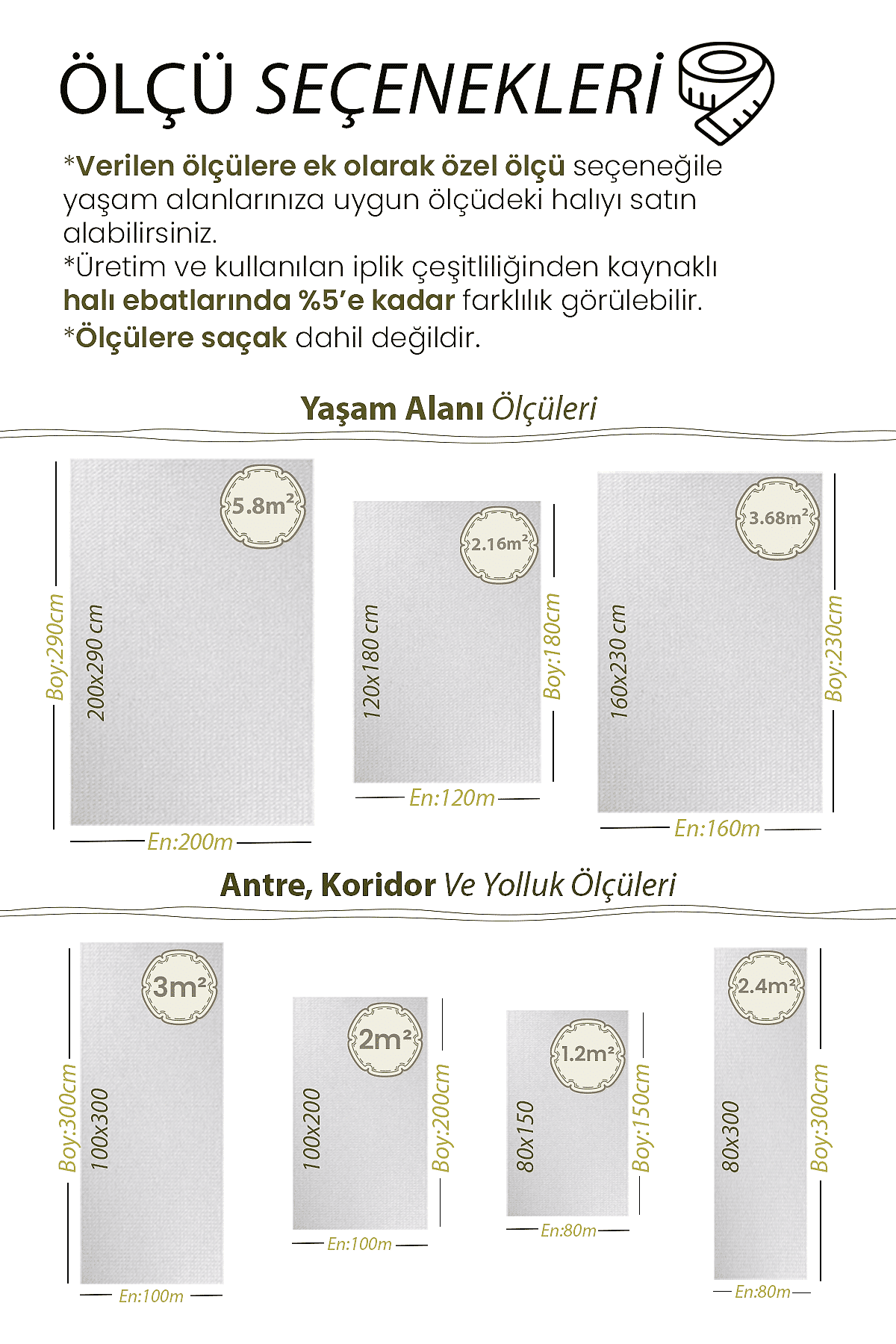 | Ölçü | 80×150, 80×300, 100×200, 120×180, 100×300, 160×230, 200×290, 240×340 |