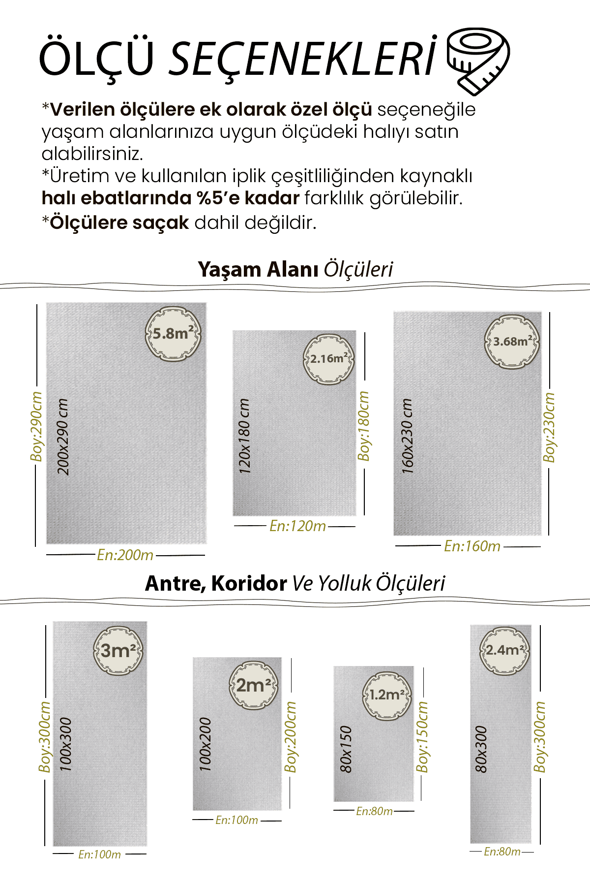 | Ölçü | 80×150, 80×300, 100×200, 100×300, 120×180, 160×230, 200×290 |