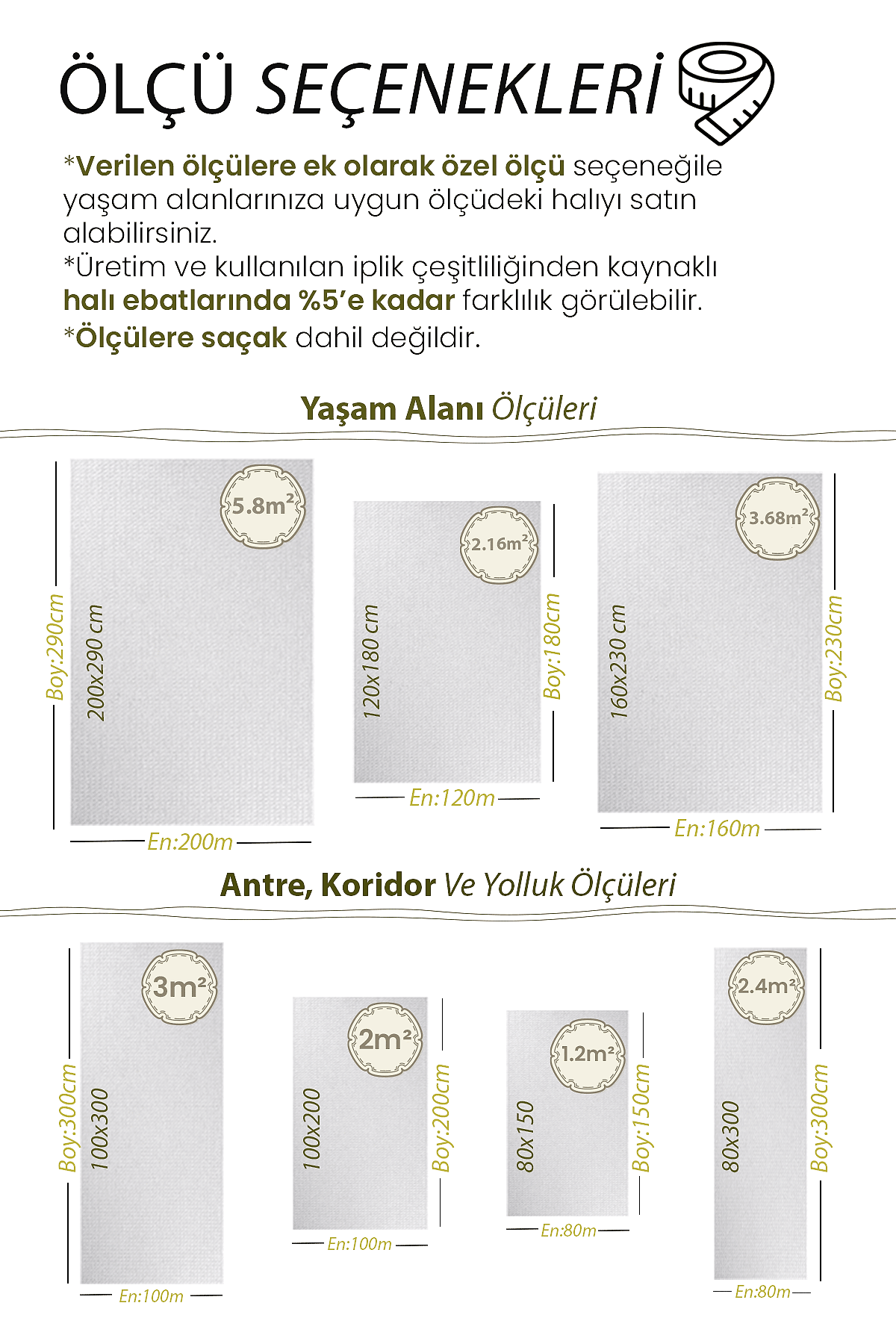 | Ölçü | 80×150, 80×300, 100×200, 100×300, 120×180, 160×230, 200×290 |