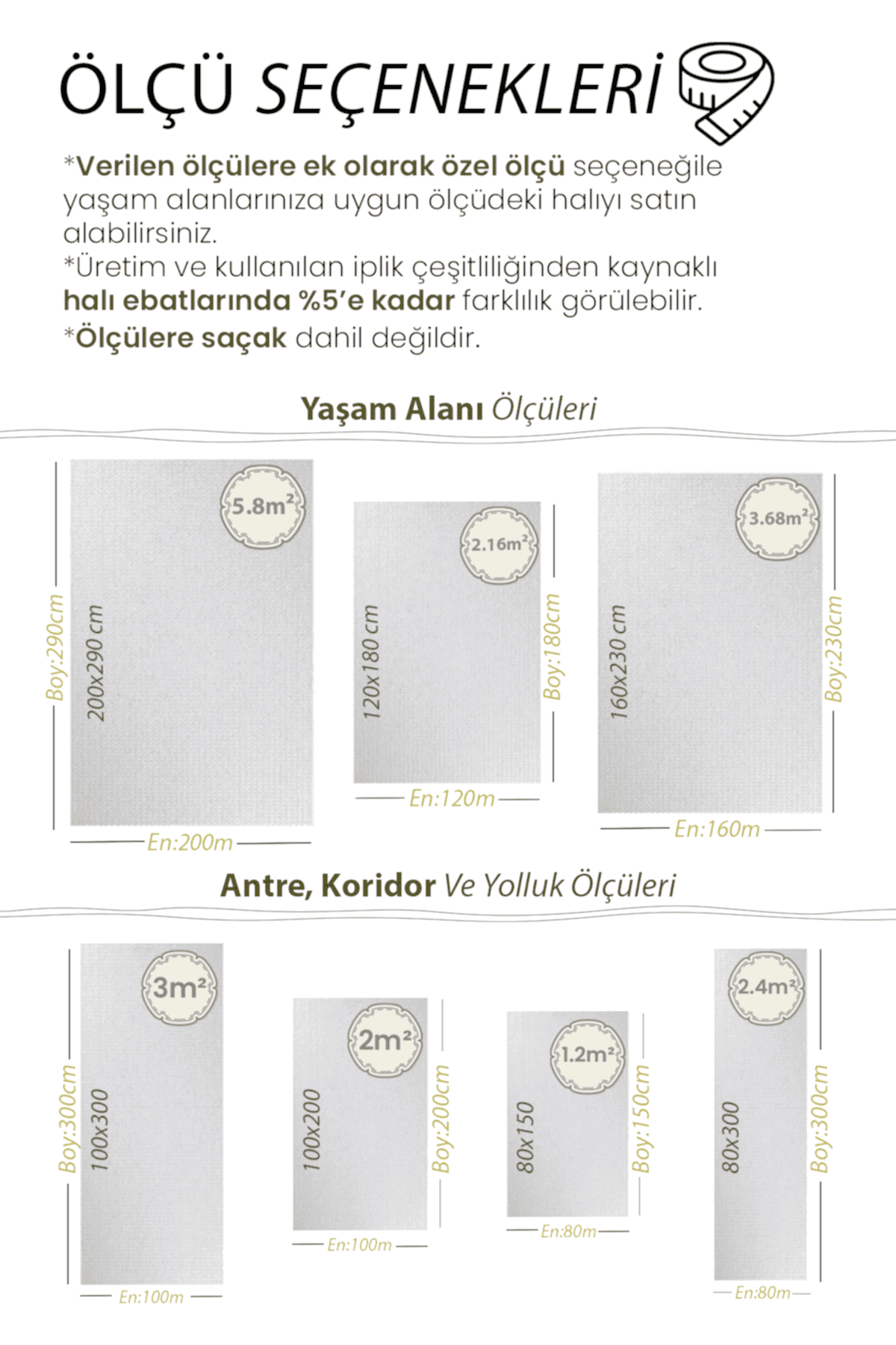 | Ölçü | 80×150, 100×200, 120×180, 80×300, 100×300, 160×230, 200×290 |