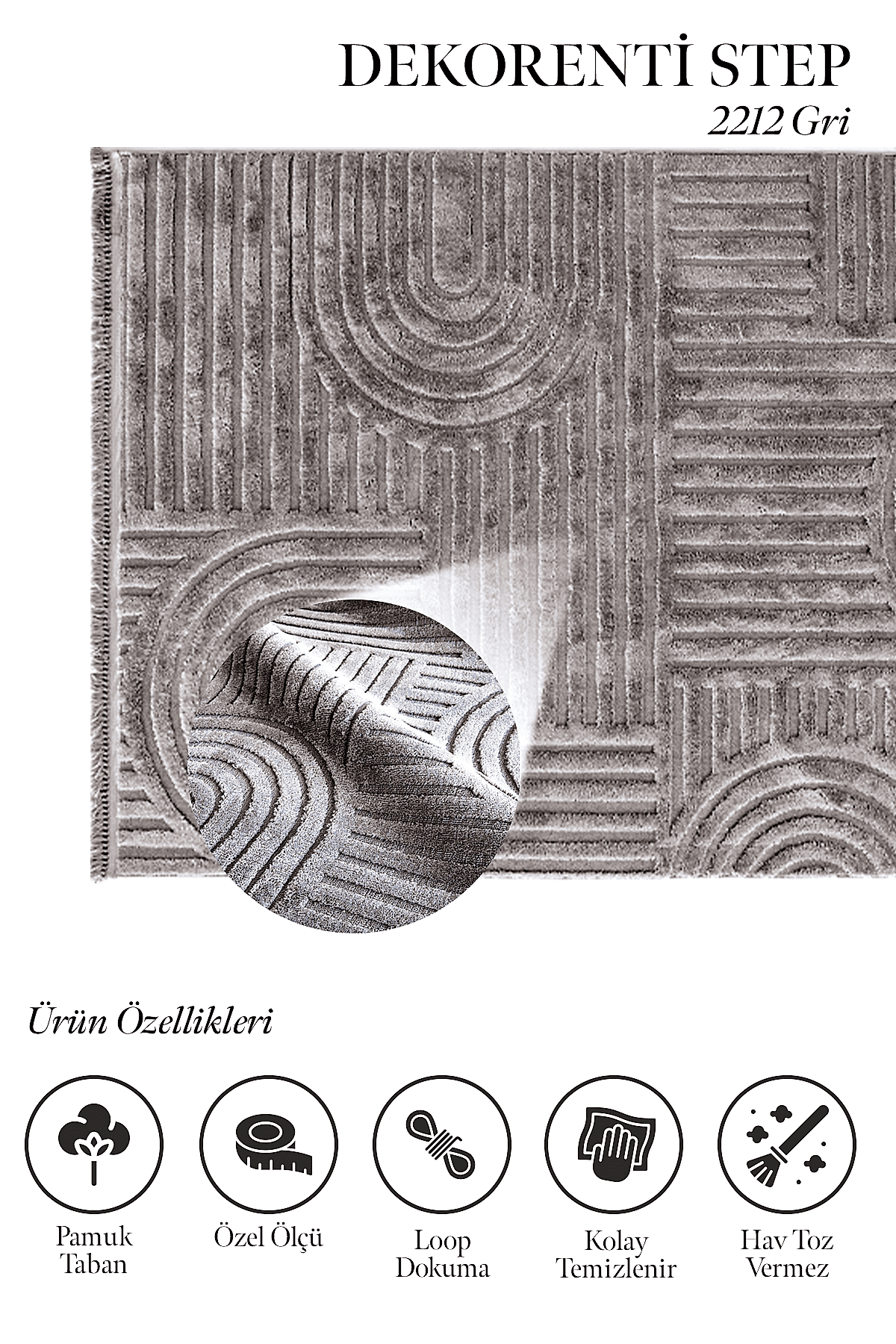 Step serisinin hem modern ve spor desen türleriyle hem de boyutlu bir halı modeli olması nedeniyle evinize modern bir hava katar. Üstelik örgü saçakları ve pamuk tabanı da halıya şık bir görünüm kazandırır. Ayrıca hav ipi polip kalitesinde antialerjik ve tozumaz özellikte olan bir makina halısıdır. İlme ucu sıklığı 310.000 ve hav yüksekliği 10 mm.dir. Yan kenarları overlok dikişlidir. Yatak odası, oturma odası, çalışma odası gibi alanlar için idealdir. Gri, vizon ve krem tonlarında renkleri olan bir modeldir. Step serisiyle evinizi yenileyin, kendinizi mutlu edin.