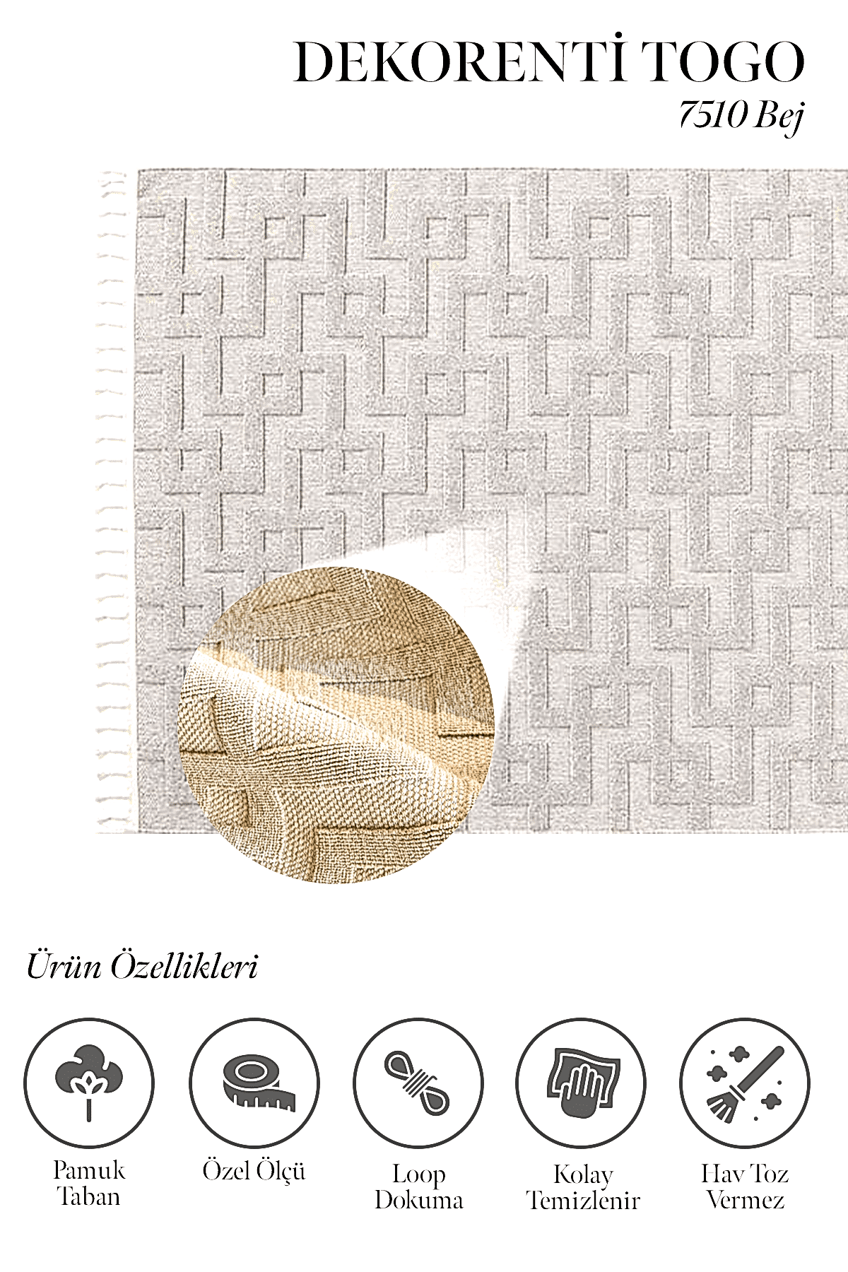 Togo Serisi Dekorenti markasının hafifliği ve boyutlu desenleri ile ön plana çıkan modellerindendir. Ayrıca çok fazla çeşidi olan geometrik desenlere sahip Togo serisi ile evinize uygun halıyı daha kolay seçebilirsiniz. Desenlerinde gri, bej, beyaz ve antrasit renklere sahiptir. Püsküllü saçaklarıyla halıya şık ve dekoratif bir görüntü verir. Yan kenarları overlok dikişlidir. Togo jüt tabanlı, iplik türü polip olan makine halısıdır.
