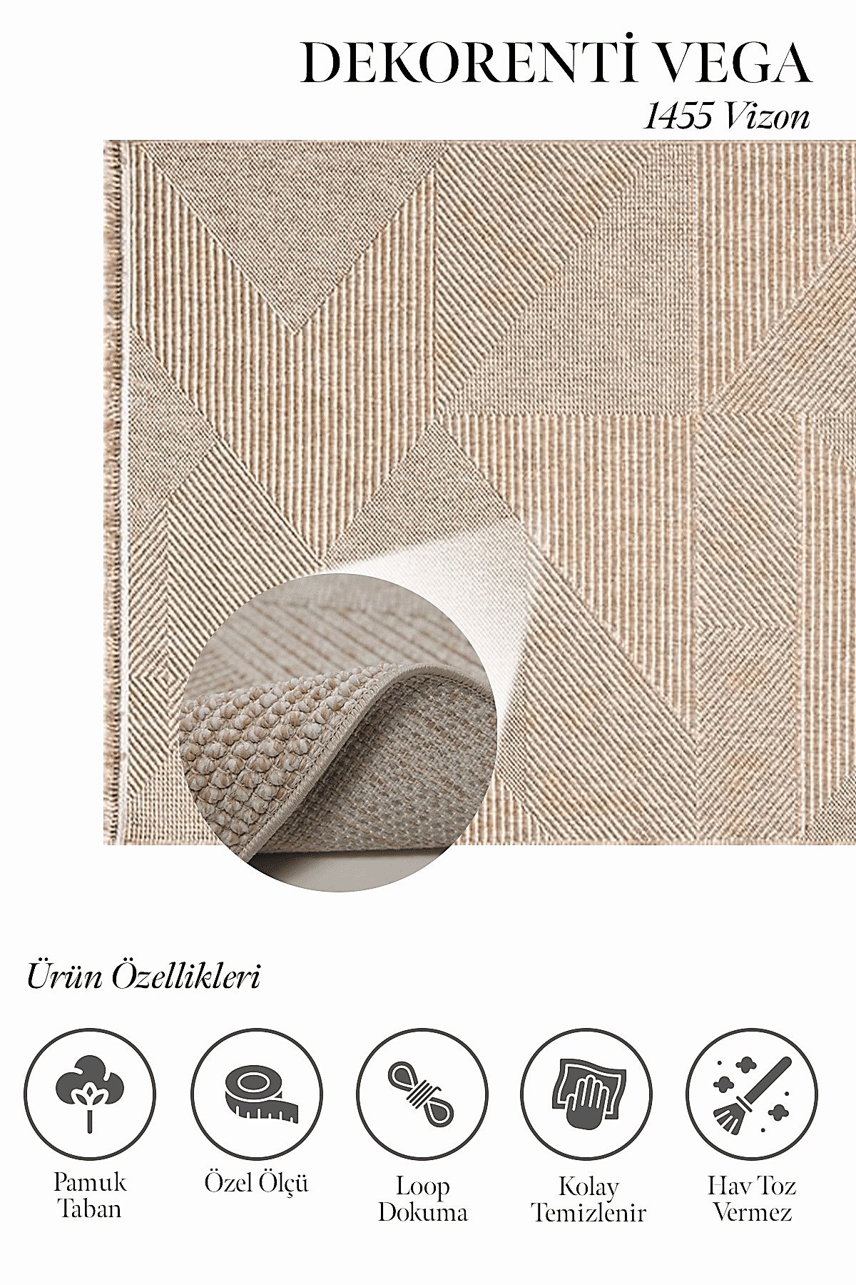Vega Serisi hav ipi polip olan pamuk tabanlı, sisal&loop dokuma şekliyle dokunan bir makina halısıdır. Parlak yüzeyi olmasından dolayı halıya güzel bir görünüm verir. Neme- küfe, kire ve lekeye dayanıklıdır, ve temizliği kolaydır. Bunlara ek olarak keçelenme, tüylenme daha az görülür. Ayrıca dekoratif bir halıdır ve antialerjiktir. Üstelik Vega serisi dokumasında evlerde çok tercih edilen krem, vizon ve gri tonlarında renkler kullanılmıştır. Vega hem genç ve spor desen türündedir hem de sade düz renkli, geometrik şekilli ve saçaklı halılardır. Hav yüksekliği 7 mm. dir. ve 67.200 ilme ucu sıklığındadır, yan kenarları overlok dikişlidir. Evin her alanında kullanılır. Özellikle kış bahçesi, kapalı balkon, hol, antre, koridor için idealdir. Dekorenti halı markasının yeni serisi Vega, sadeliği sevenler için iyi bir seçenektir.