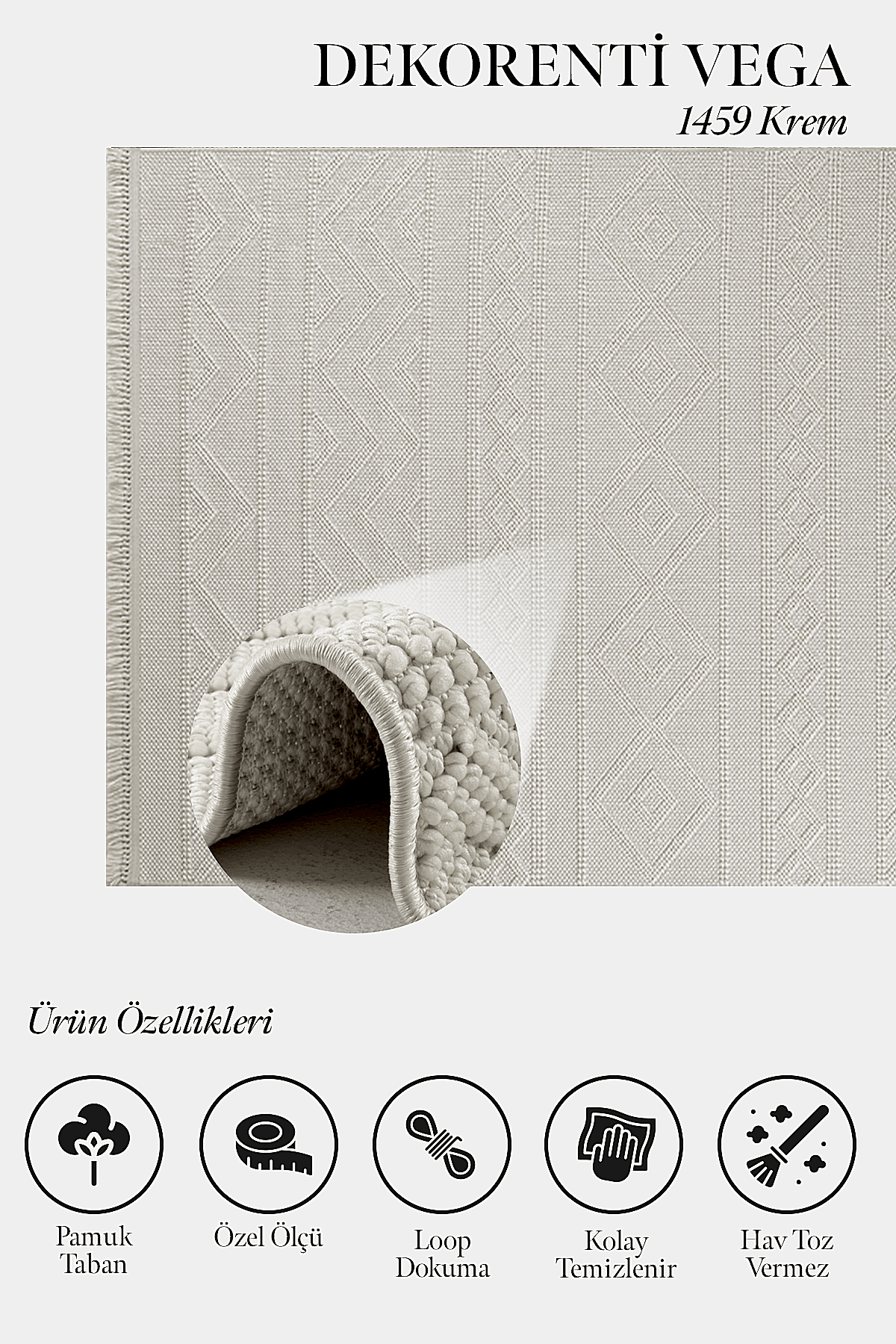 Vega Serisi hav ipi polip olan pamuk tabanlı, sisal&loop dokuma şekliyle dokunan bir makina halısıdır. Parlak yüzeyi olmasından dolayı halıya güzel bir görünüm verir. Neme- küfe, kire ve lekeye dayanıklıdır, ve temizliği kolaydır. Bunlara ek olarak keçelenme, tüylenme daha az görülür. Ayrıca dekoratif bir halıdır ve antialerjiktir. Üstelik Vega serisi dokumasında evlerde çok tercih edilen krem, vizon ve gri tonlarında renkler kullanılmıştır. Vega hem genç ve spor desen türündedir hem de sade düz renkli, geometrik şekilli ve saçaklı halılardır. Hav yüksekliği 7 mm. dir. ve 67.200 ilme ucu sıklığındadır, yan kenarları overlok dikişlidir. Evin her alanında kullanılır. Özellikle kış bahçesi, kapalı balkon, hol, antre, koridor için idealdir. Dekorenti halı markasının yeni serisi Vega, sadeliği sevenler için iyi bir seçenektir.