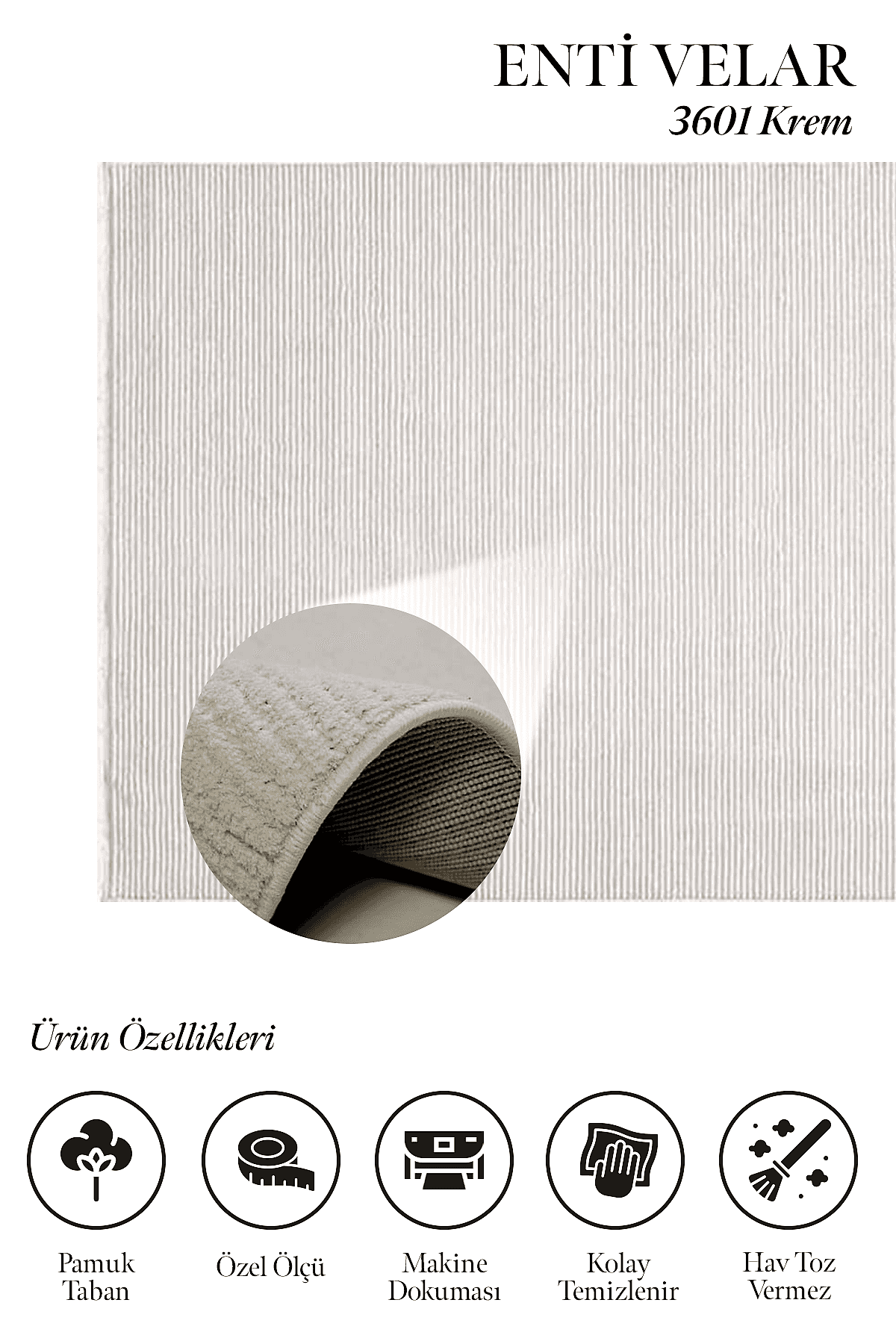 Enti halı markasının yeni serisi Velar’ın her bir modelinin tek renk olması, modern desenleri ve boyutlu dokusu ayırt edici özellikleridir. Üstelik mikro polyester iplik türünde olmasından dolayı yumuşak bir yüzeye sahiptir ve hav, tüy çıkarmaz. Ayrıca krem, vizon, gri antrasit gibi çok kullanılan renklere sahiptir. Yan kenarları overlok dikişli, baş kısımları saçaklıdır ve pamuk tabanlı bir modeldir. Velar serisi gerek kolay temizlenir olması gerek neme küfe dayanıklı olmasından dolayı koridor, antre, hol, yatak odası, kış bahçesi, kapalı balkon gibi evin bir çok alanında verimli olarak kullanılır. Diğer özelliklerine bakıldığında. 400.000 ilme ucu sıklığında, 8mm. hav yüksekliği olan bir makina halısıdır.