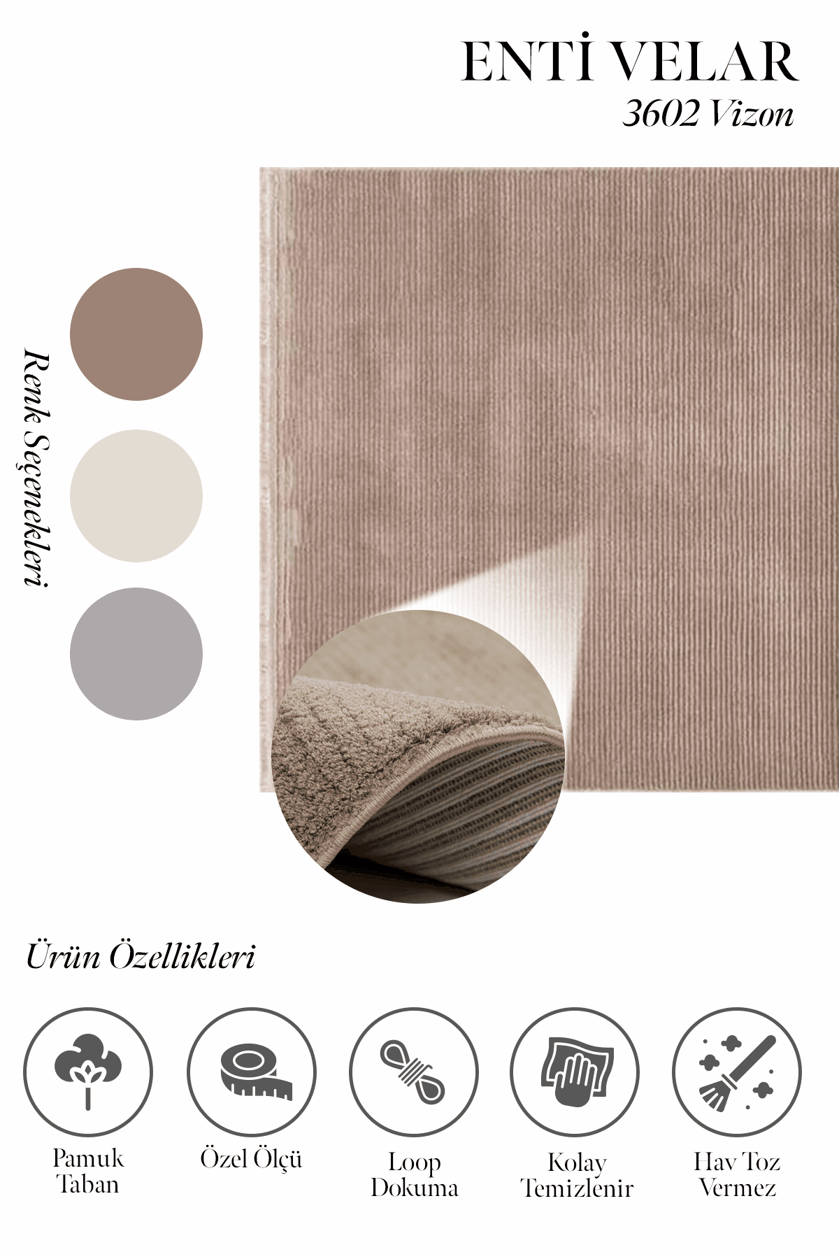 Enti halı markasının yeni serisi Velar’ın her bir modelinin tek renk olması, modern desenleri ve boyutlu dokusu ayırt edici özellikleridir. Üstelik mikro polyester iplik türünde olmasından dolayı yumuşak bir yüzeye sahiptir ve hav, tüy çıkarmaz. Ayrıca krem, vizon, gri antrasit gibi çok kullanılan renklere sahiptir. Yan kenarları overlok dikişli, baş kısımları saçaklıdır ve pamuk tabanlı bir modeldir. Velar serisi gerek kolay temizlenir olması gerek neme küfe dayanıklı olmasından dolayı koridor, antre, hol, yatak odası, kış bahçesi, kapalı balkon gibi evin bir çok alanında verimli olarak kullanılır. Diğer özelliklerine bakıldığında. 400.000 ilme ucu sıklığında, 8mm. hav yüksekliği olan bir makina halısıdır.