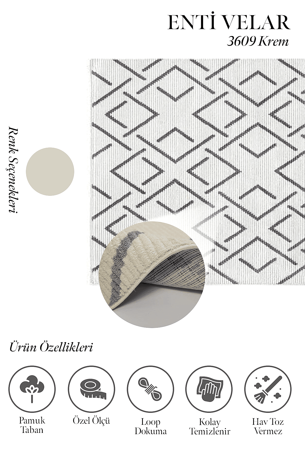 Enti halı markasının yeni serisi Velar’ın her bir modelinin tek renk olması, modern desenleri ve boyutlu dokusu ayırt edici özellikleridir. Üstelik mikro polyester iplik türünde olmasından dolayı yumuşak bir yüzeye sahiptir ve hav, tüy çıkarmaz. Ayrıca krem, vizon, gri antrasit gibi çok kullanılan renklere sahiptir. Yan kenarları overlok dikişli, baş kısımları saçaklıdır ve pamuk tabanlı bir modeldir. Velar serisi gerek kolay temizlenir olması gerek neme küfe dayanıklı olmasından dolayı koridor, antre, hol, yatak odası, kış bahçesi, kapalı balkon gibi evin bir çok alanında verimli olarak kullanılır. Diğer özelliklerine bakıldığında. 400.000 ilme ucu sıklığında, 8mm. hav yüksekliği olan bir makina halısıdır.